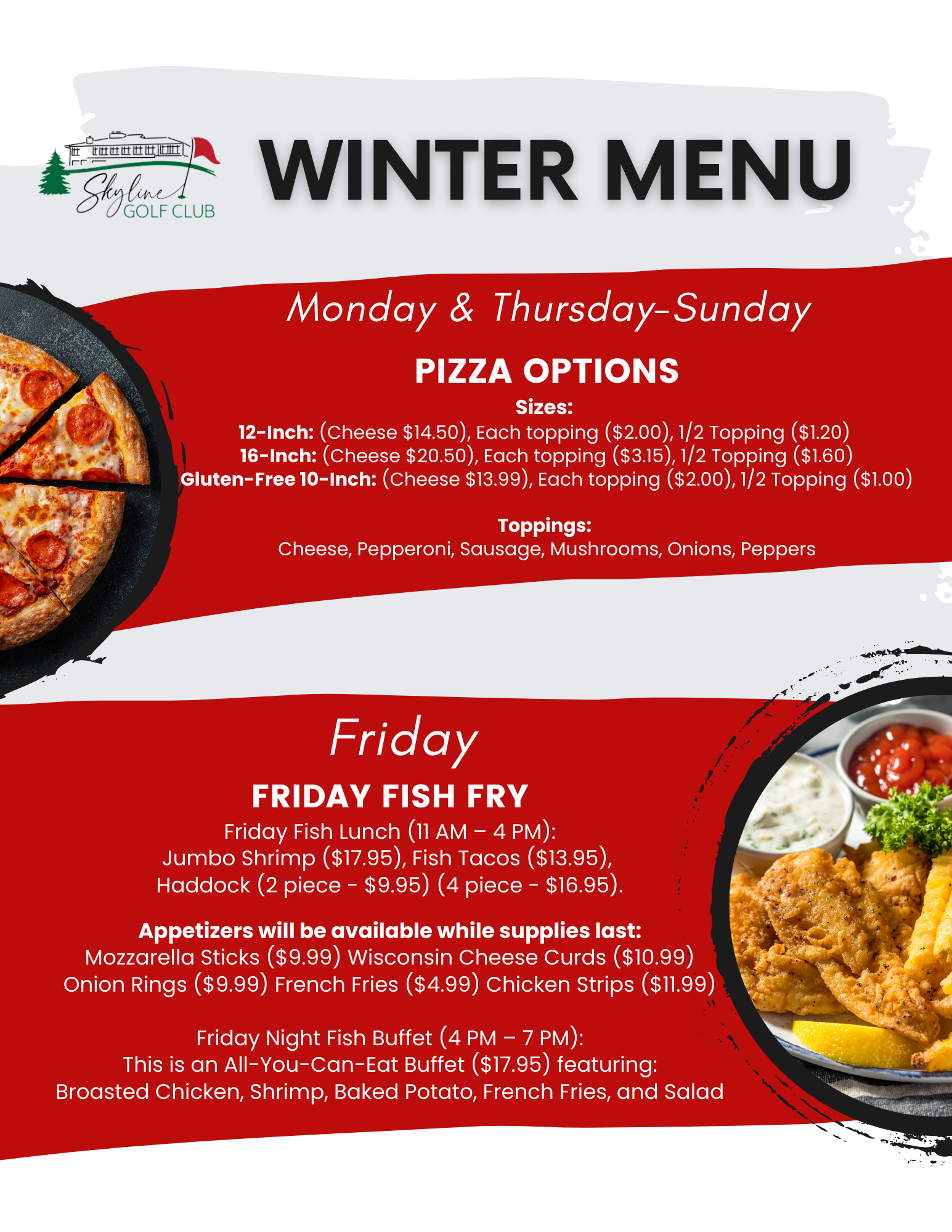 Sunday: 12 pm – 8 pm Monday: 11 am – 9 pm Tuesday: CLOSED Wednesday: CLOSED Thursday: 4 pm – 9 pm Friday: 11 am – 4 pm (Fish Fry Lunch) 4 pm – 8 pm (Fish Buffet 4 pm – 7 pm) Saturday: 4 pm – 8 pm
